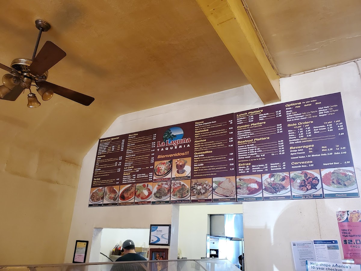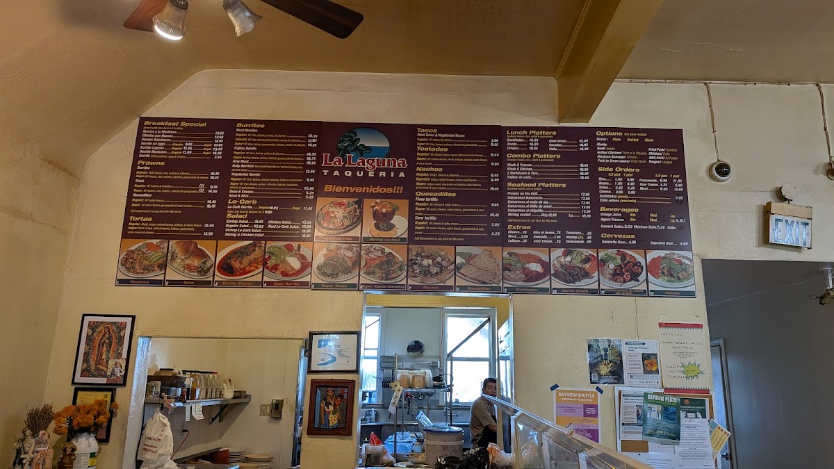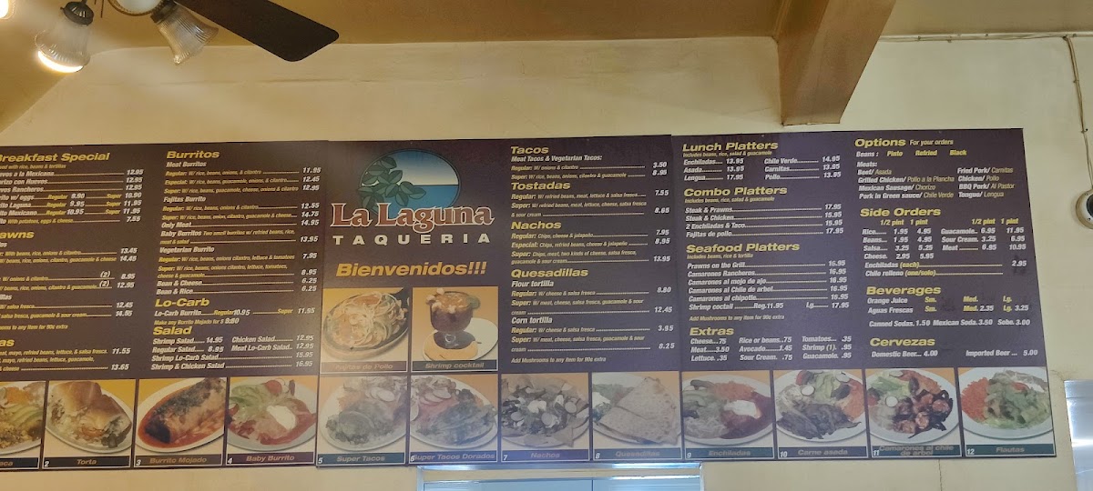 La Laguna offers a vibrant and flavorful menu, showcasing a variety of Mexican favorites perfect for any time of day. For breakfast, dishes like Huevos A La Mexicana, Chorizo Con Huevos, and Huevos Rancheros start the day off right. For something heartier, the Burrito Laguna is a popular choice. If you're craving seafood, the Super Shrimp Burrito and Camarones Al Mojo De Ajo are sure to impress, while the Prawns On The Grill is a perfect seafood platter. The restaurant also features an impressive range of Tortas, such as the Super Torta, and tacos, including the Super Meat Taco and Super Vegetarian Taco. For something a little lighter, the selection of Low Carb Salads, like the Shrimp Low Carb Salad, is a fresh and satisfying option. Tostadas and nachos are also great shareable choices, with favorites like the Super Tostada and Super Nacho. The combo platters, such as the Steak and Prawns or Fajitas De Pollo, are a great way to enjoy a variety of flavors. Rounding out the menu are sides like Guacamole and Cheese, along with refreshing Aguas Frescas and Mexican sodas. Whether you're in the mood for a light meal or a satisfying feast, La Laguna offers a wide range of delicious options to suit all tastes.